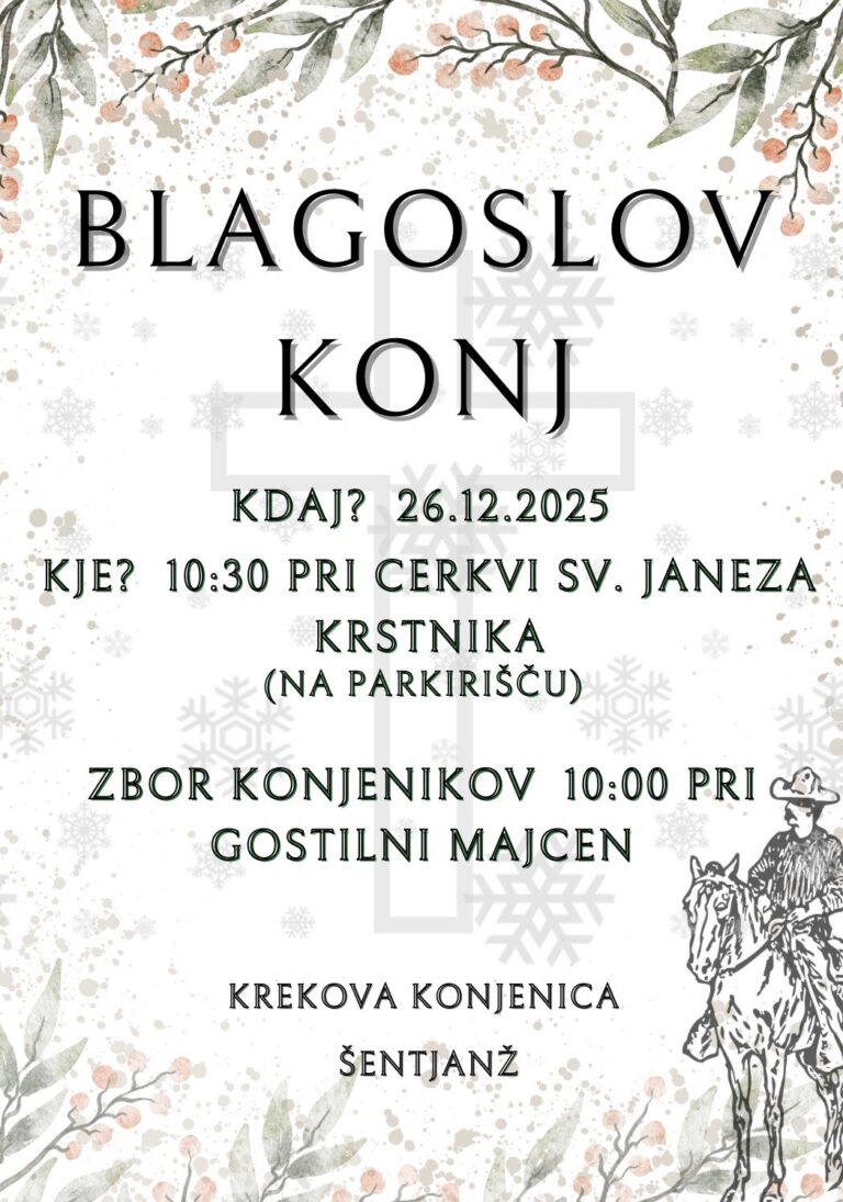 Vljudno vabljeni, v petek 26.12.2025 na blagoslov konj, pred cerkev sv. Janeza Krstnika v Šentjanžu. Blagoslov se prične ob 10:30 uri. Zbor konjenikov pa…