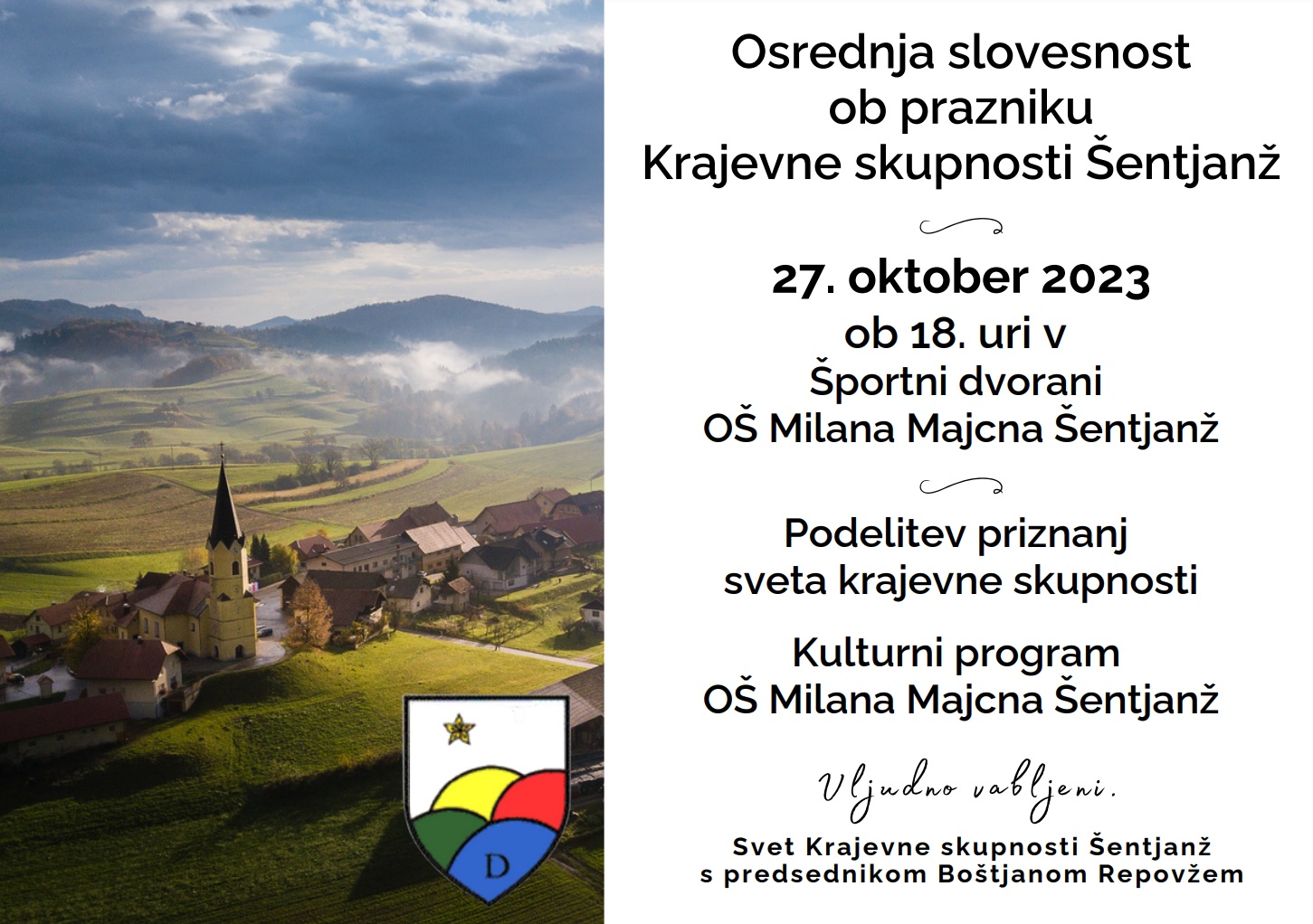 VABILO NA OSREDNJO SLOVESNOST OB PRAZNIKU KRAJEVNE SKUPNOSTI ŠENTJANŽ20 oktobra, 2023ObvestilaKrajevna skupnost Prejšnji Prispevek GASILSKA VAJA PROSTOVOLJNEGA GASILSKEGA DRUŠTVA ŠENTJANŽ Naslednji Prispevek PRAZNOVANJE KRAJEVNEGA PRAZNIKA 2023