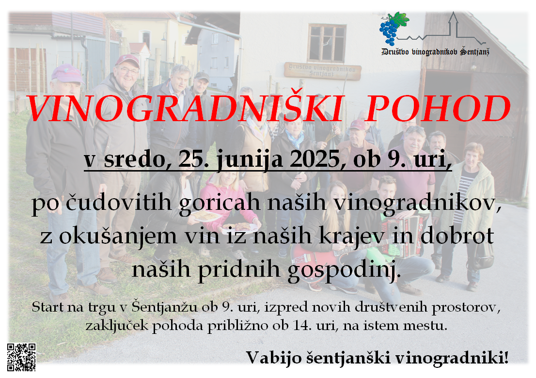 VABILO NA VINOGRADNIŠKI POHOD20 junija, 2025ObjaveDruštvo vinogradnikovVinogradniški pohod bo v sredo, 25. junija 2025, ob 9. uri. Več si preberite v priloženem vabilu. Prejšnji Prispevek VABILO NA ŠENTJANŠKI KULTURNI VEČER Naslednji Prispevek Oldies goldies 2025 – srečanje starodobnih vozil kluba Hrast Tržišče