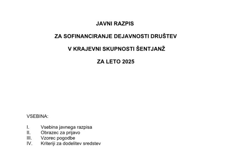 Spodaj si lahko prenesete JAVNI RAZPIS ZA SOFINANCIRANJE DEJAVNOSTI DRUŠTEV V KRAJEVNI SKUPNOSTI ŠENTJANŽ ZA LETO 2025.
